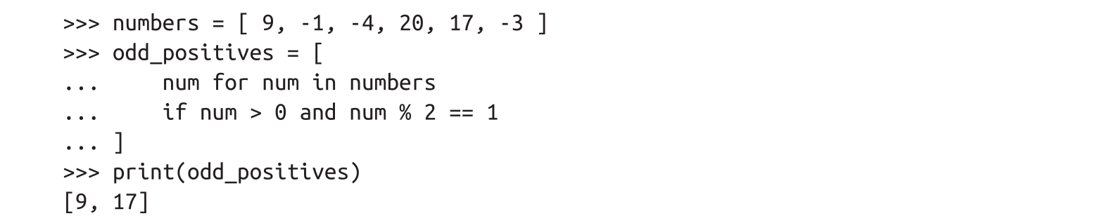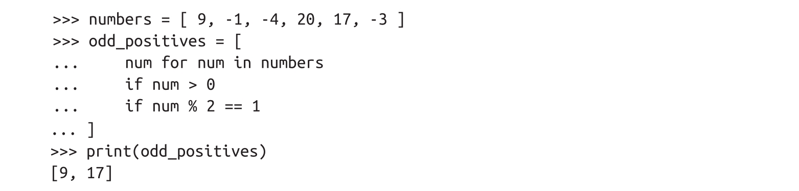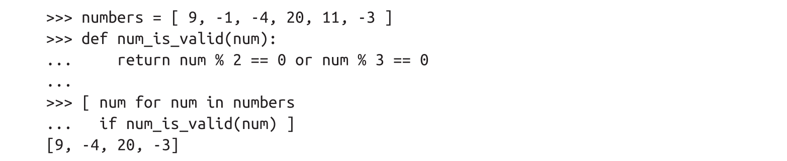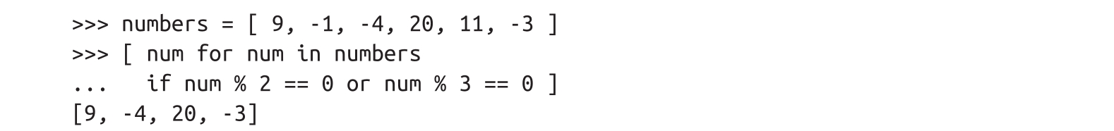 假设你想让元素至少满足一条if语句的条件,排除不匹配任何条件的元素。在这种情况下,必须使用带有or的if语句,且不能在同一个列表推导式中用or连接多个if语句。例如,可以使用以下代码过滤是2或3倍数的数字: