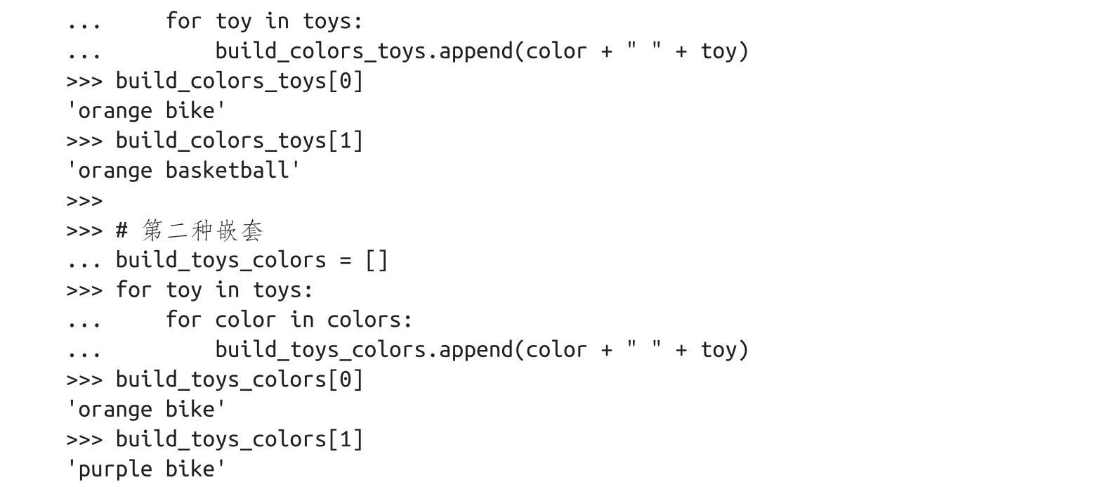 代码分别利用序列colors和toys两两组合,形成最终列表。最终列表共有12个元素,数量等于两个列表长度的乘积。