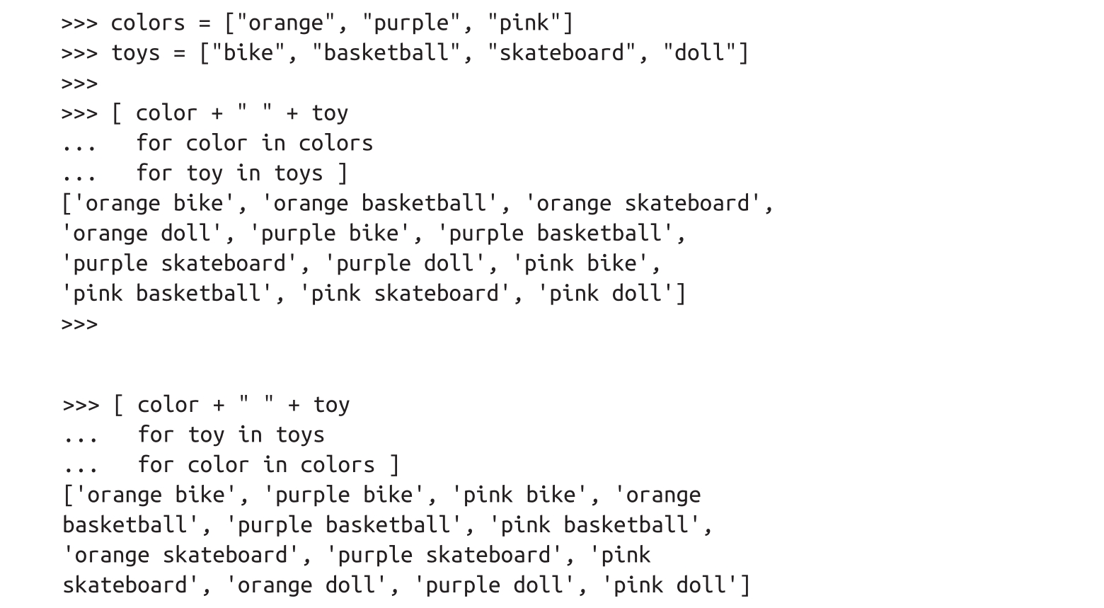 与前面的colors和toys示例不同,前者的各个for循环是独立的。当将for循环链接起来时,顺序非常重要: