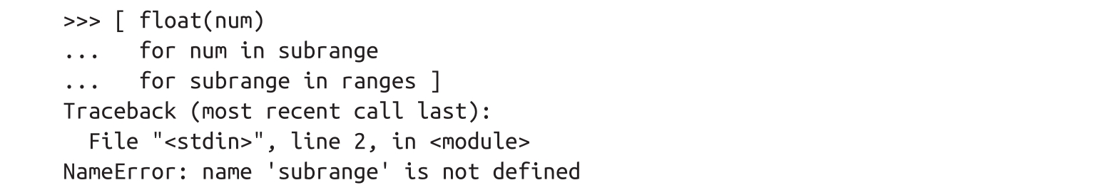 Python从左到右解析列表推导式。如果第一个子句是for num in subrange,则此时subrange尚未定义。因此,需要将for subrange in range放在前面。也可以连续使用多个for循环,第一个子句只需引用先前定义的数据源,后续for循环引用前方的for循环,比如定义好的subrange。