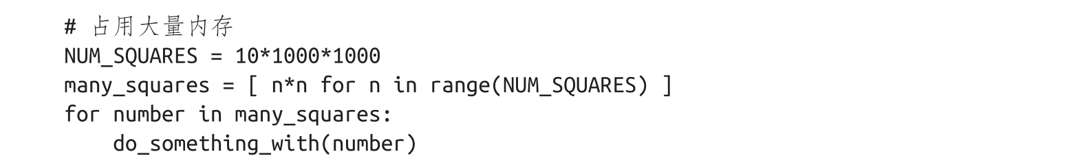 必须等待列表many_squares全部创建完毕,即分配好所有内存,才能调用函数do_something_with(),这会导致内存使用量急剧增加。