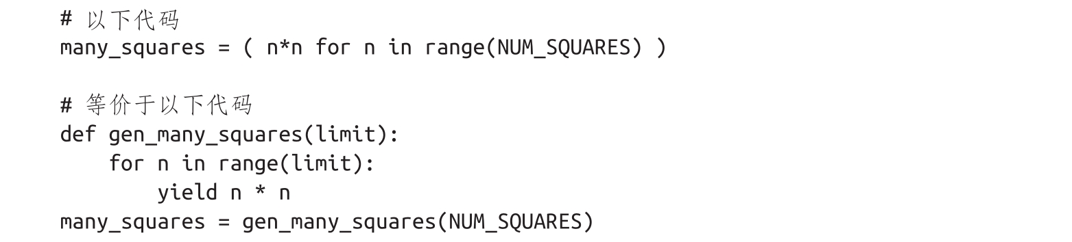 当需要列表时,可以直接使用推导式。但有时不是真的需要列表,而是想使用不会大幅增加内存占用的方法。例如第1章开头的示例: