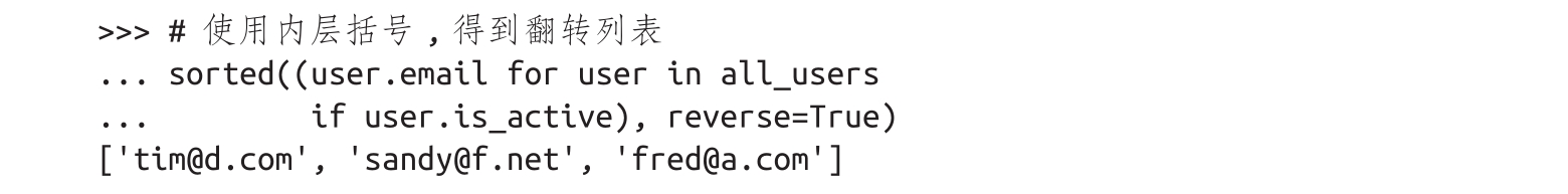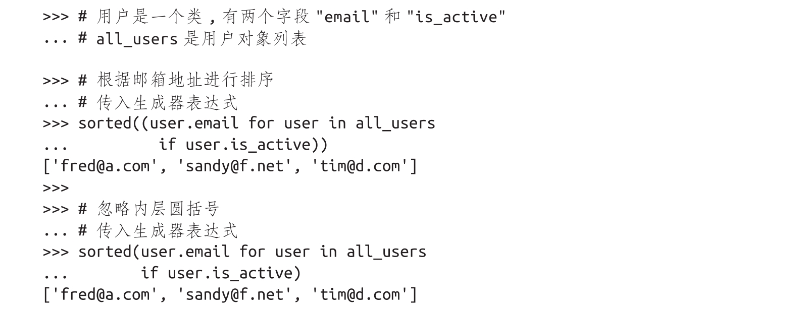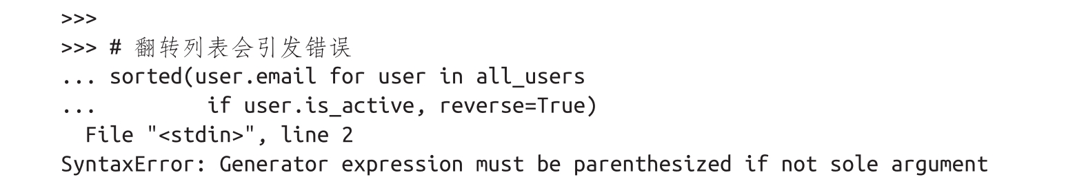 注意,生成器表达式大幅提高了代码可读性(只要稍微练习,代码就很自然)。还需要注意一点,只有在将生成器表达式传递给单参数的函数或方法时,才能嵌入生成器表达式。否则,会引发语法错误: