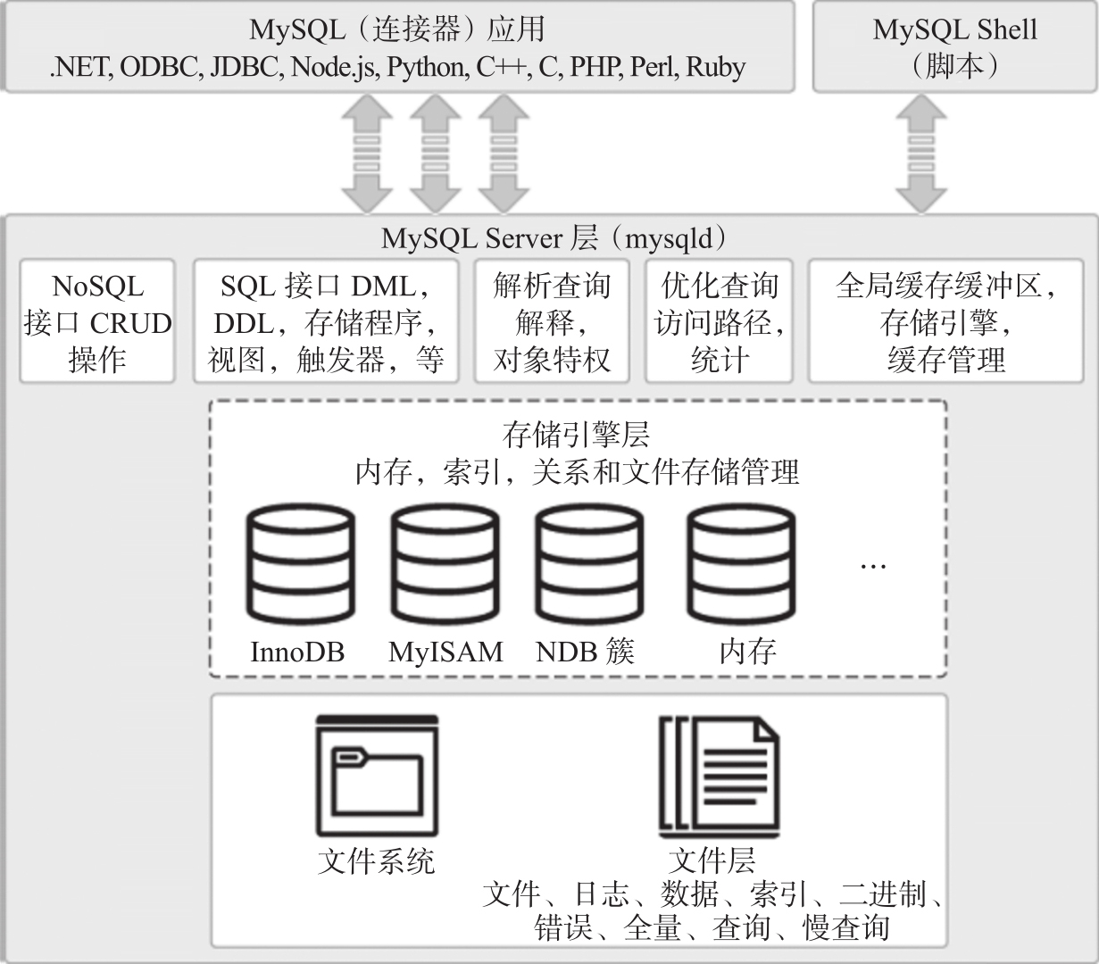 图2-1是直接引用的MySQL官方文档中的图片,从图中可以看到MySQL主要分为三层: