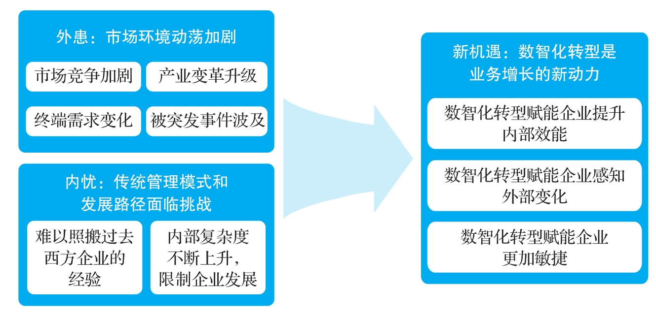 数字技术为企业带来了新机遇,可以赋能企业提升内部效能、增强感知外部环境的能力,使其在面对外部变化时也可敏捷应对。数智化转型为企业带来了业绩的提升,成为业务增长的新动力。我国政府也出台政策,大力推进企业数智化转型。在国家的引导和支持下,企业可借助数字技术,通过数智化转型实现自身变革(1.3节)。对数智化转型有了基本认知,企业方能走上变革之路。