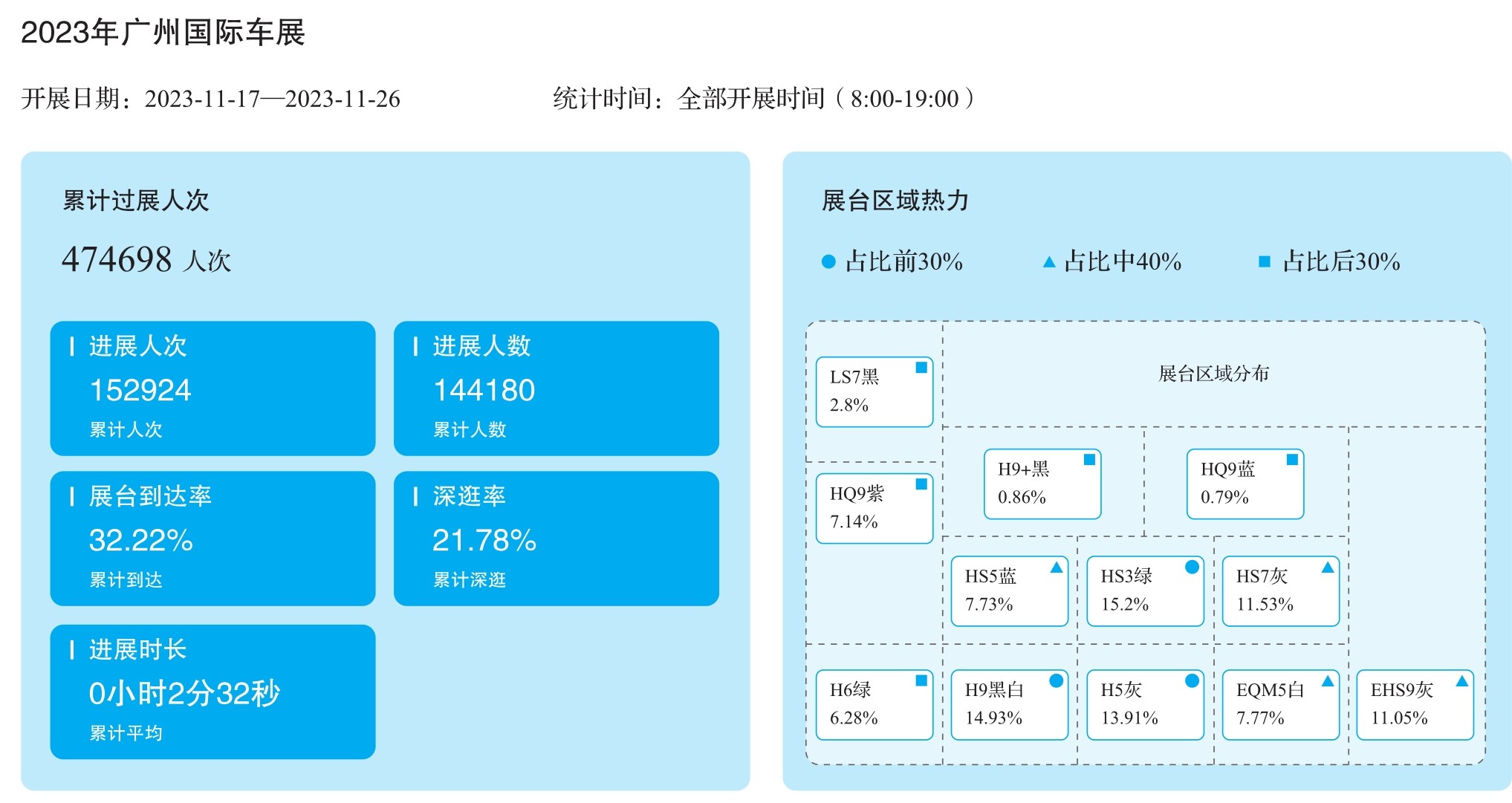 以数据思维为指导开展数智化转型,还要求企业对运营中沉淀的数据进行分析,用数据驱动决策。企业每日的运营数据都被记录在案,通过数据分析就可以对业务实践进行量化和评估。基于数据的决策可以推动业务不断优化,形成闭环迭代。例如,以前中国一汽的营销中心每年需要投入大量资源和精力筹备多次车展,但一直没有明确的效果优化方向。中国一汽通过数字化技术为车展实现了数字孪生,实时记录车展中的展台位置、活动和热力图(见图2-1),并据此进行相应的人员调配和讲解配置。事后,营销中心还可综合客流、订单来源和人员服务等数据对车展效果进行量化评价,据此优化下一场车展的部署。小到一场车展,大到整个集团的流程乃至组织机构的调整,企业都可以通过数据掌握所有业务活动的真实情况,实现数据赋能。过去企业管理中的流程是否合理?部门、机构、单元如何设置?哪些工作应设独立部门负责?哪些部门应该合并?又有哪些部门应该裁撤?对于这些问题,除了效仿标杆以外,几乎都是大家拍脑袋做决策。中国一汽将所有线下发生的作业与线上的业务单元实时联动,然后依据运行数据实现业务单元和流程的迭代。经过半年的数据运营,中国一汽将内部流程精简了58%,效率大幅提升。