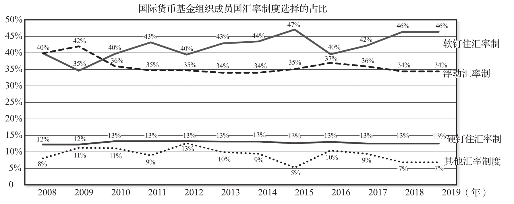 如图2.4所示,在2008—2019年间,国际货币基金组织成员国的汇率制度选择没有发生重大变化。采用浮动汇率制的国家近年来占比为34%或35%,而采用软钉住汇率制的国家近年来占比从不到40%增加到46%。尽管当代国际货币体系通常被认为采用浮动汇率制,但很显然,世界上大多数国家并非如此。