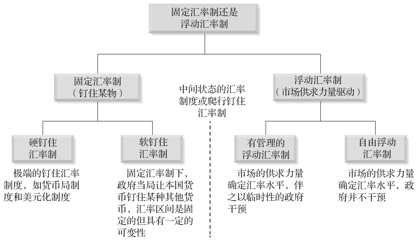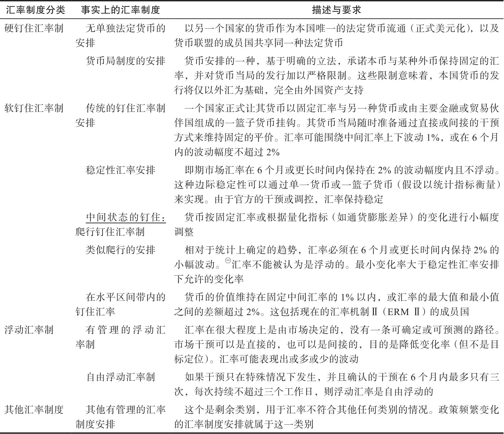 表2.1展示了国际货币基金组织自2009年1月起采用的汇率制度分类方法。该方法基于国际货币基金组织观察到的实际行为(即事实上的汇率制度),而不是基于各国政府的官方政策声明(即名义上的汇率制度)。在分类过程中,首先要确定该国货币的汇率是由市场供求力量主导还是由官方行为主导。虽然分类方法存在分歧,但是总体上可以分为四个基本类别。