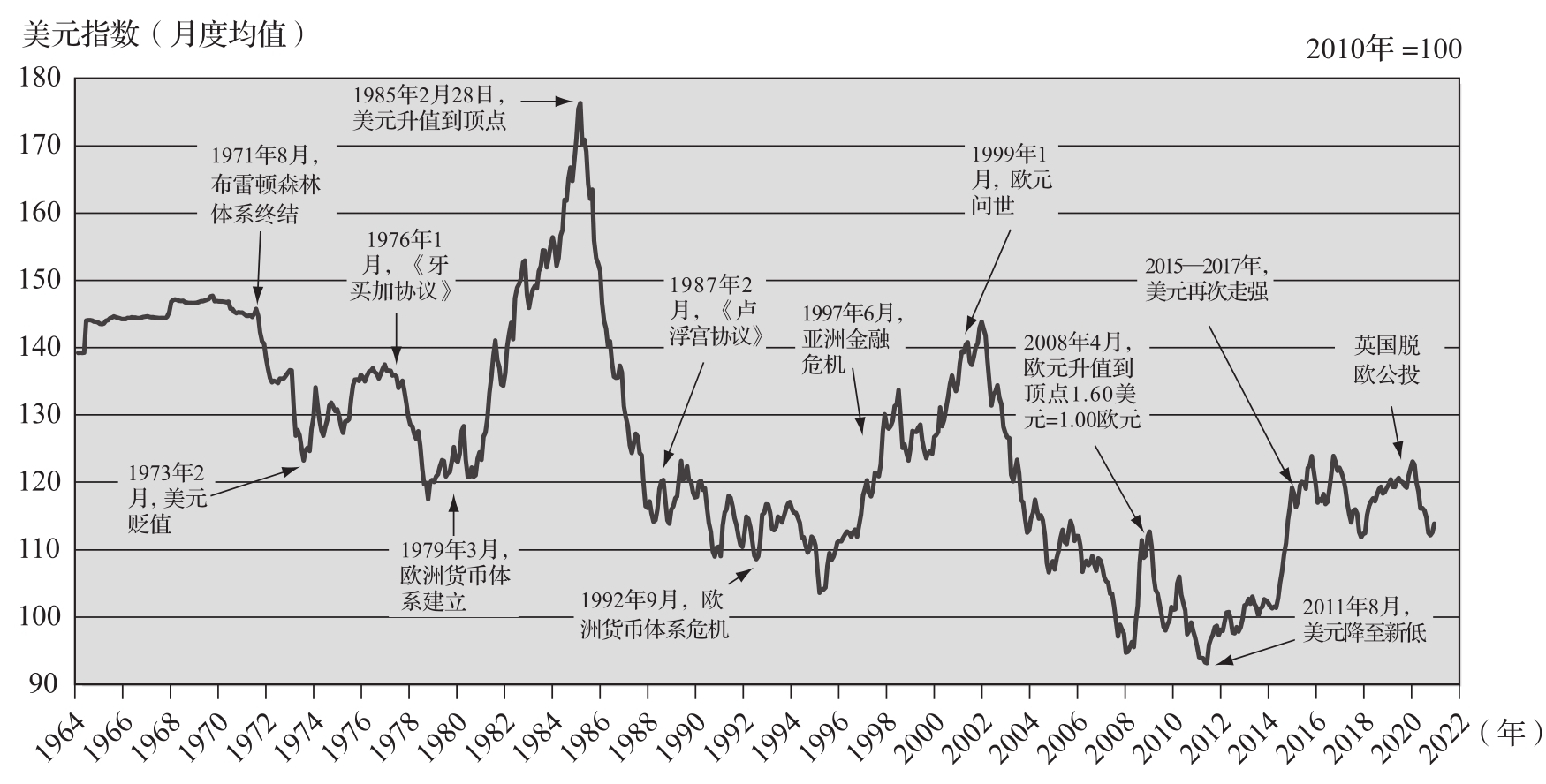 图2.2记录了近年来若干重要的事件:1979年欧洲货币体系(EMS)建立、1985年美元升值并达到顶点、1992年欧洲货币体系危机、1997年亚洲金融危机、1999年欧元问世以及英国脱欧(脱离欧盟)公投。