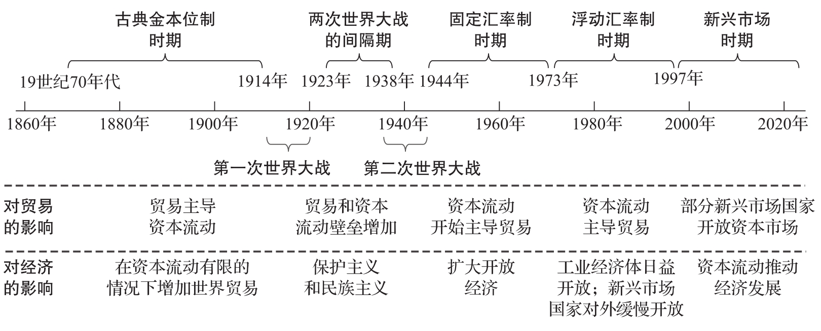 正如麦金农所述,国际货币体系本质上是各国就货币兑换达成的一种非正式协议。几个世纪以来,黄金、白银和其他有价值的物品曾被规定为货币的标准,这些标准依据不同国家间的多种协议而并不固定。通过回顾过去两个世纪国际货币体系的演变(如图2.1所示),我们能够更好地理解,今天这个由固定汇率、浮动汇率、爬行钉住汇率等多种机制组成的复杂体系是如何形成的,有助于评估在全球商务活动中,各企业的弱点和面临的挑战。