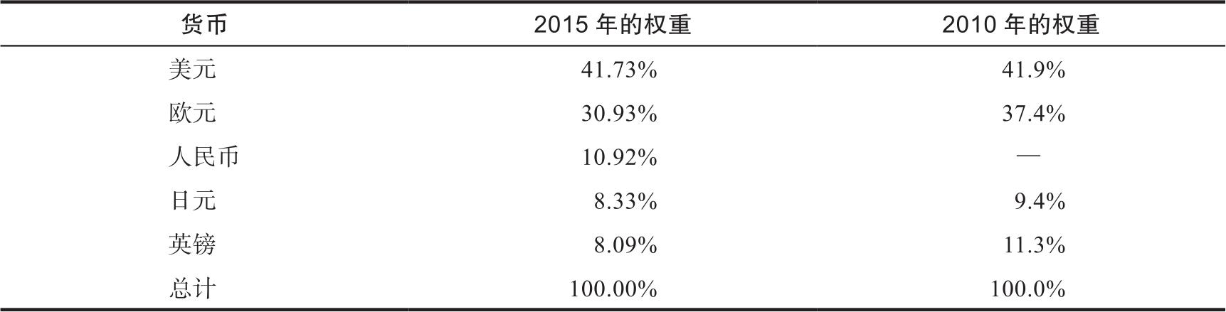 国际货币基金组织每五年更新一次特别提款权货币篮子中各种货币的权重。2015年的权重自2016年10月1日起生效,具体如下: