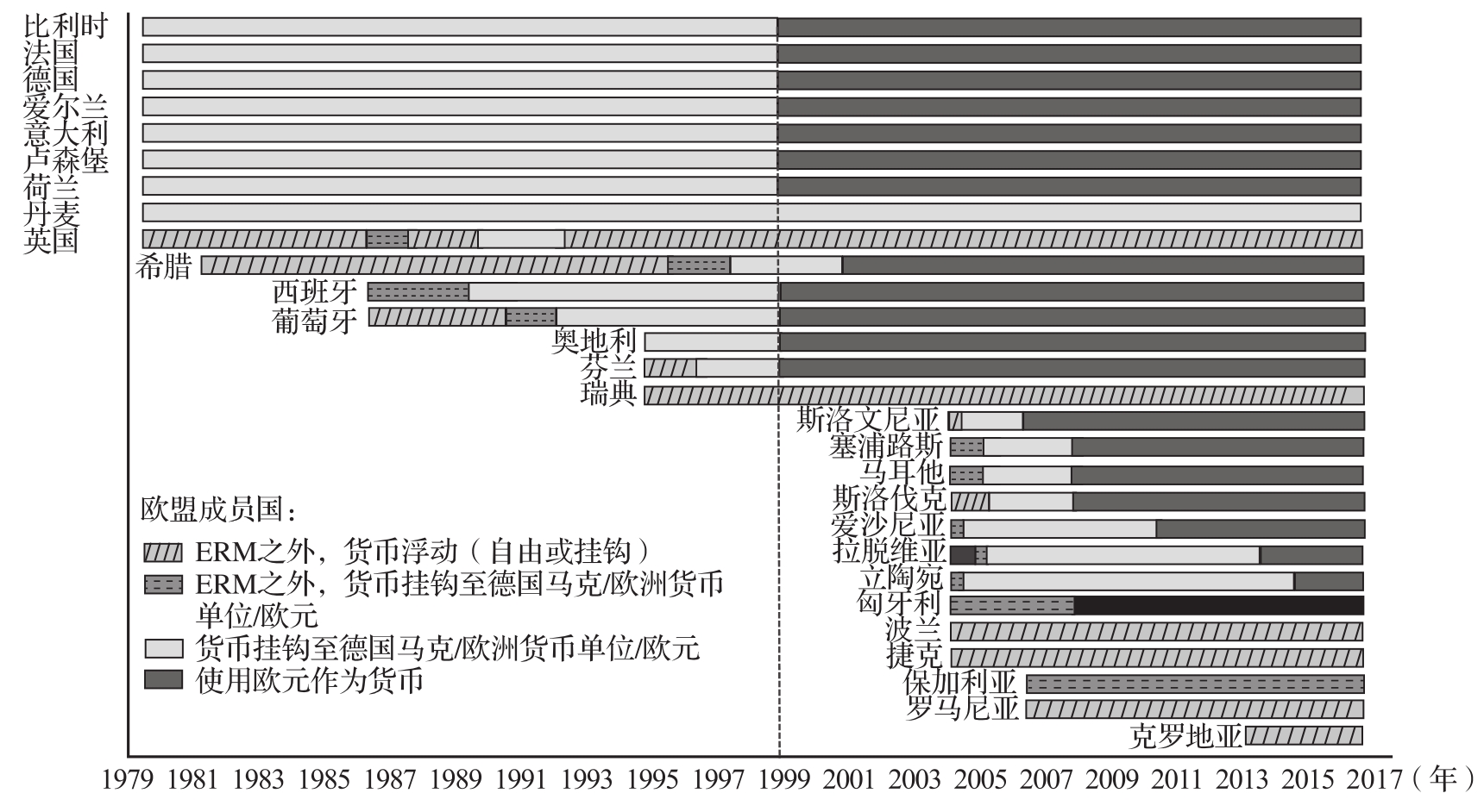 欧盟最初的15个成员国也是欧洲货币体系的成员国。欧洲货币体系在成员国货币之间形成了固定汇率体系,为了将汇率维持在既定中心汇率的±2.5%的范围内,相关各方对汇率偏离都有责任进行干预和管理。这种固定汇率制虽然有过调整,但从1979年一直维持到了1999年。在1992年和1993年的汇率危机中,该体系的韧性经受了严峻的考验,但最终还是维持了下来。
