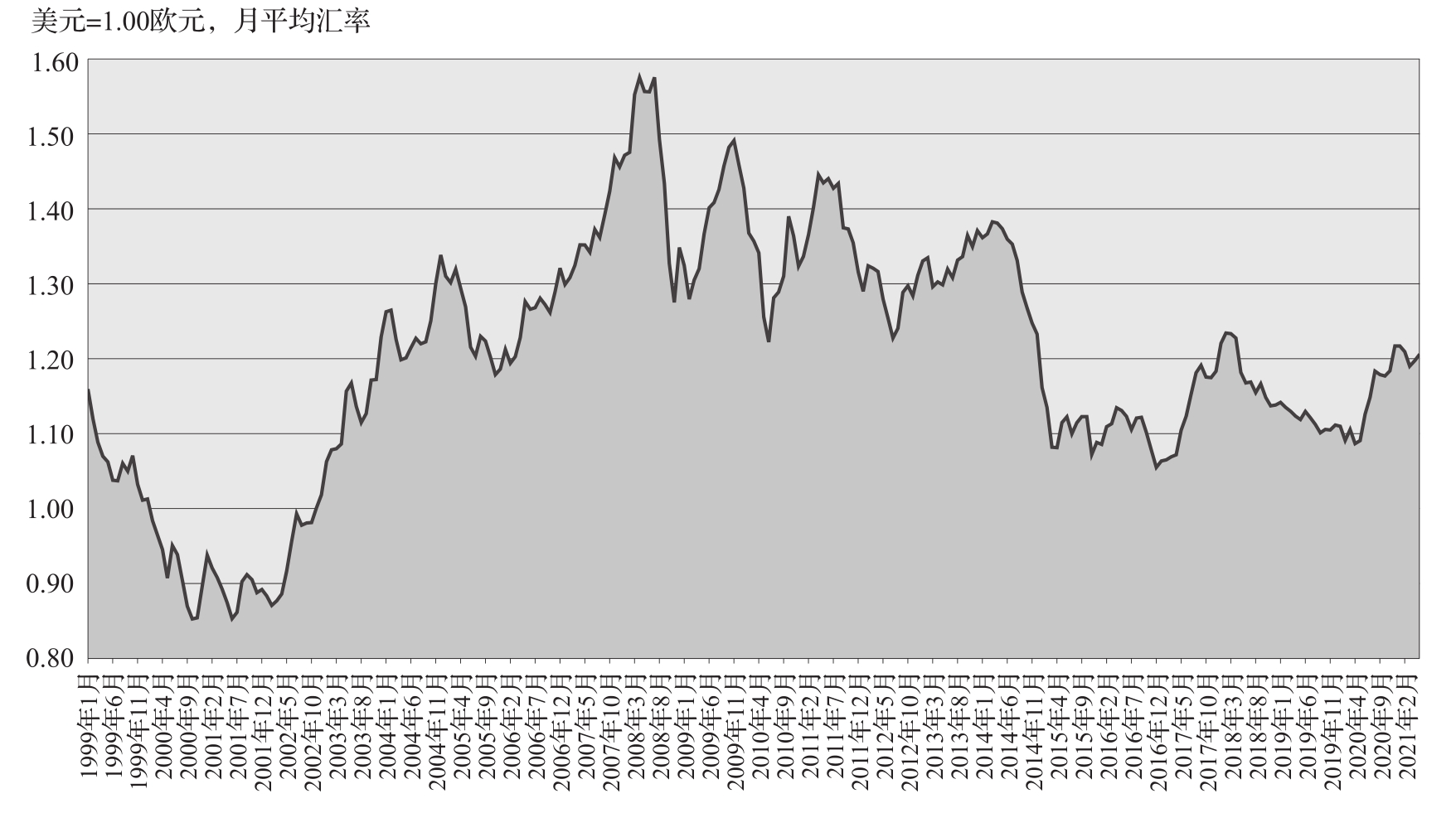 1999年1月4日,欧元开始在世界货币市场上交易。欧元的首次亮相相当顺利。然而,欧元自推出以来,价值持续下滑,主要原因是美国经济的强劲和美元的坚挺,以及欧洲经济与货币联盟各成员国经济的低迷。从2002年起,欧元相对于美元开始升值,并在2008年夏季达到顶峰,如图2.6所示。自那以后,欧元兑美元的汇率大致呈下降趋势,但具有显著的波动性。