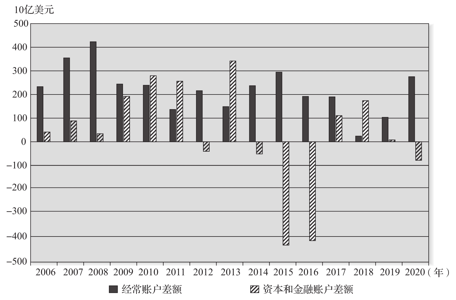 然而,中国在同一时间经历了巨额的经常账户顺差和有时规模可观的资本和金融账户顺差。这种情况是非常罕见的,显示出中国经济增长的特殊性。通常情况下,如此巨大的经常账户顺差会导致资本和金融账户出现逆差,但中国经济的乐观前景吸引了大规模的资本流入,使资本和金融账户也保持顺差。这也受中国严格的资本外流限制的影响,制约了资本流出中国。需要注意的是,2014—2016年,资本和金融账户差额确实出现了负值,这更符合传统的理论预期。这在一定程度上是中国金融部门持续放松管制以及经济增长放缓的结果。资本和金融账户差额在2017—2019年重新转为顺差,部分原因是中国政府重新加强资本管制和吸引了创纪录的外国直接投资。