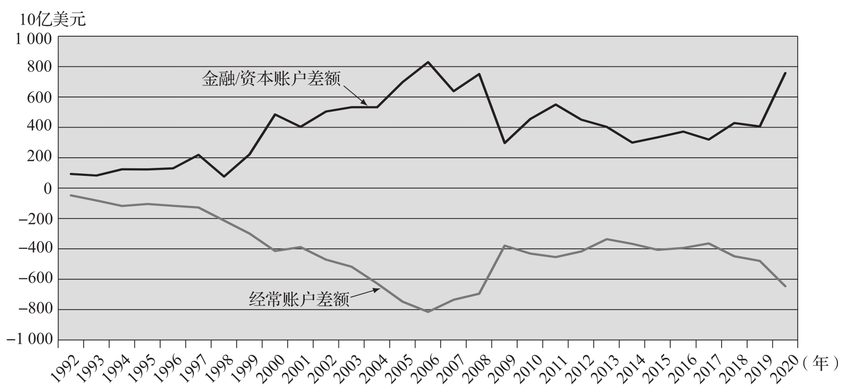图3.4展示了美国1992—2020年的经常账户差额和金融/资本账户差额。该图展示了上述两大账户之间的反向关系,这是国际收支平衡表基本的经济和会计关系之一。
