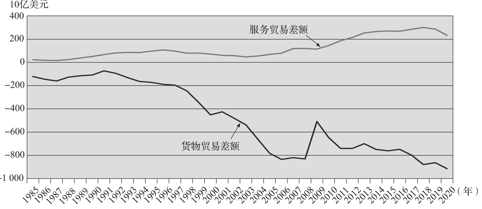 图3.1 1985—2020年美国货物贸易差额和服务贸易差额