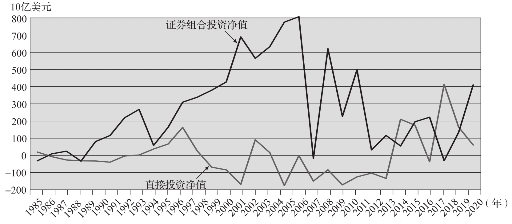 无论是短期资本还是长期资本,它们都会流向投资者认为的在承担相应风险的情况下能够获得最大回报的地方。虽然从会计角度来看,大量以直接投资为主要形式的资本流入可能被称为“国际债务”,但这实际上是对本国就业、生产、服务、技术和其他有竞争力的投资的长期承诺,会内生性地提高该国产业的竞争力。图3.2展示了美国1985—2020年的直接投资净值。全球金融实务3.1介绍了过去10多年其他国家对美国和中国的直接投资。
