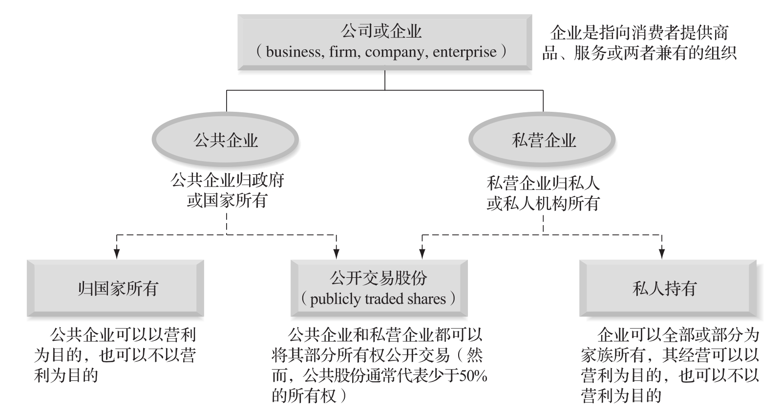 公司所有权的另一个特点是专业术语上的模糊性。由私人主体或一小群私人个体所拥有的企业被称为私营企业。然而,如果上述所有者希望在资本市场上出售部分公司所有权(例如,在证券交易所上市并交易公司的股票),那么该公司的股票将被公开交易。在当今世界,有许多混合所有权结构可以改变公司的财务目标。图4.1简要描述了这些所有权的区别。