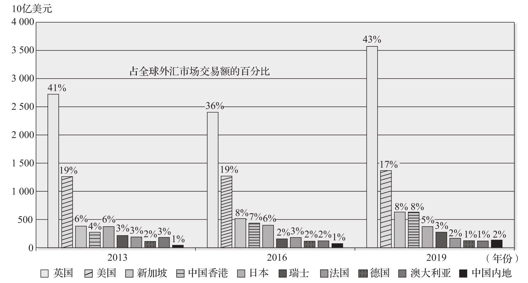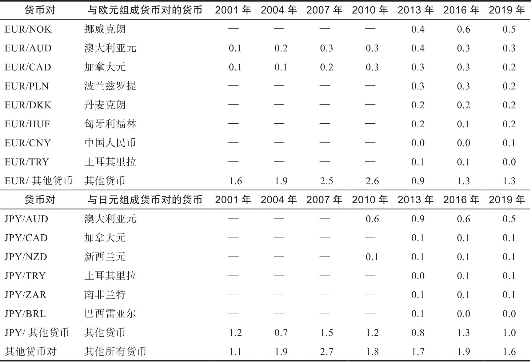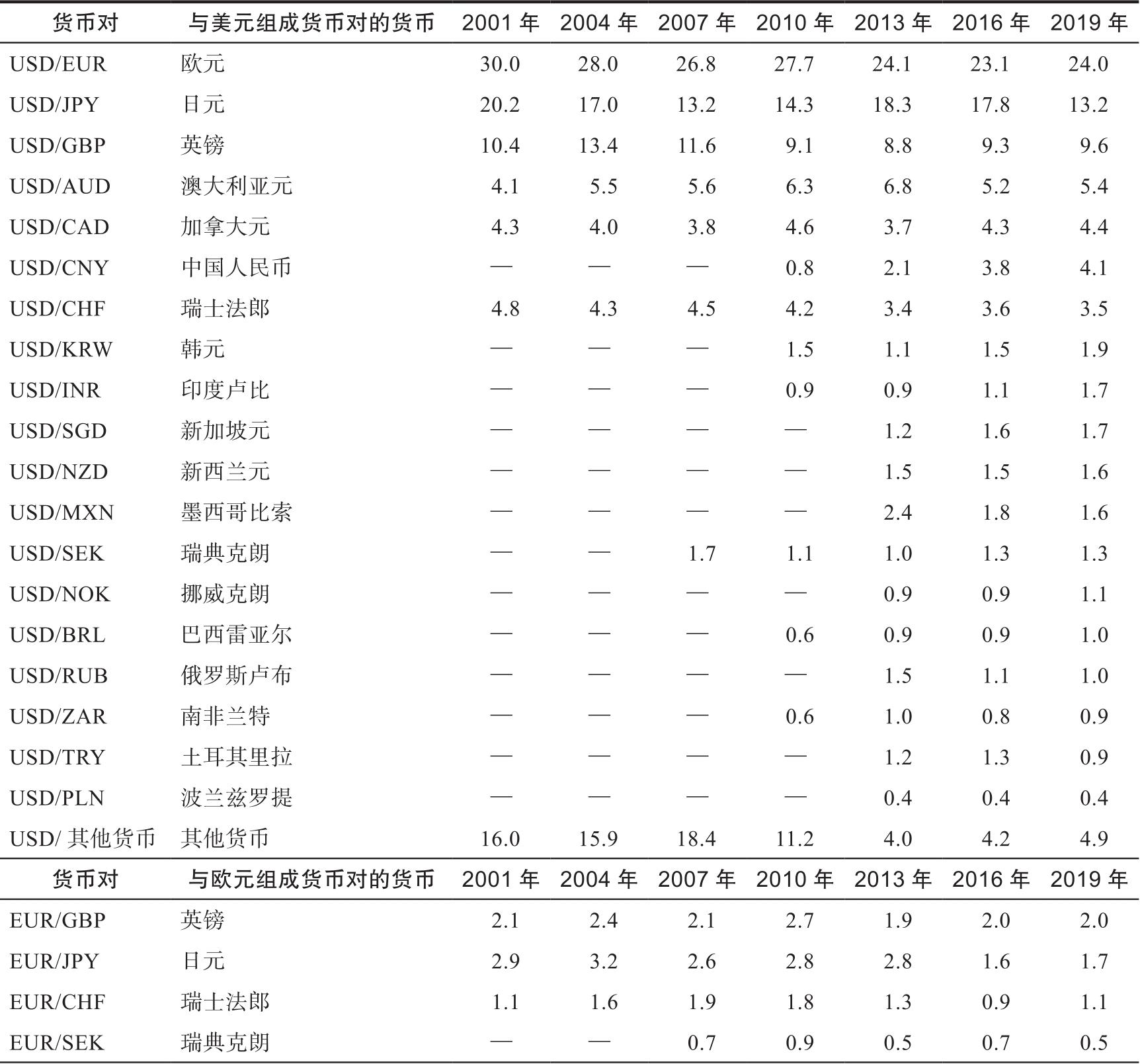 资料来源:Constructed by authors based on data presented in Table 3,p.11,of“Triennial Central Bank Survey:Foreign Exchange Turnover in April 2019,”Bank for International Settlements,September 2019.