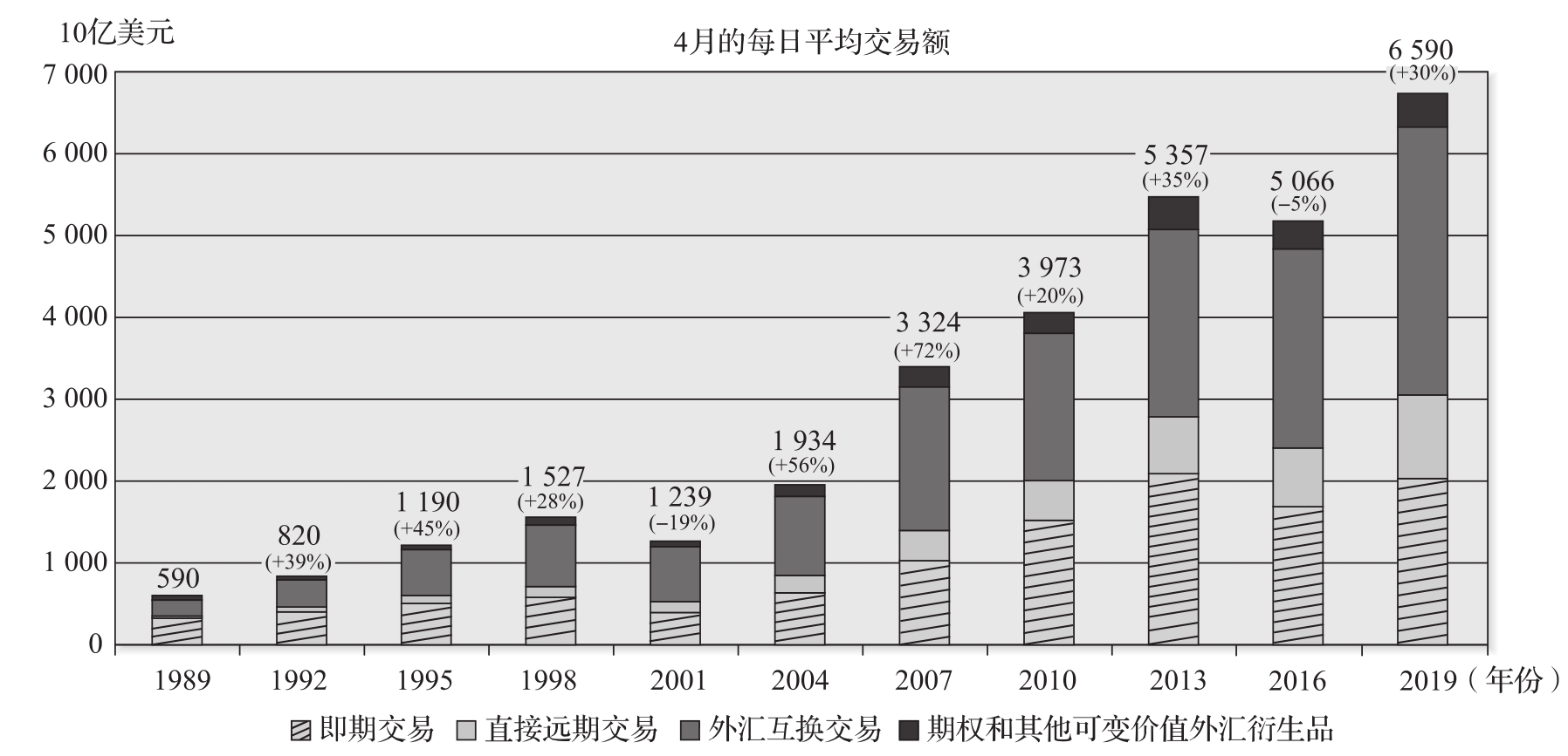 截至2019年4月,全球外汇市场的每日平均交易额为6.6万亿美元,其中即期交易额为2.0万亿美元,直接远期交易额为1.0万亿美元,外汇互换交易额为3.2万亿美元,期权和其他可变价值外汇衍生品交易额为0.4万亿美元。虽然2000—2001年的全球经济衰退明显抑制了市场交易,但2008—2009年的全球金融危机似乎并未产生类似影响。颇有意思的是,2016年的数据显示,即期交易额自2001年以来首次出现下降。然而,到2019年,交易额重回增长轨道,较2016年同比增长了30%。国际清算银行和其他机构认为,电子交易的增加、更多追求利润的投资者入市以及大数据的不同分销商的相互作用推动了这一增长。