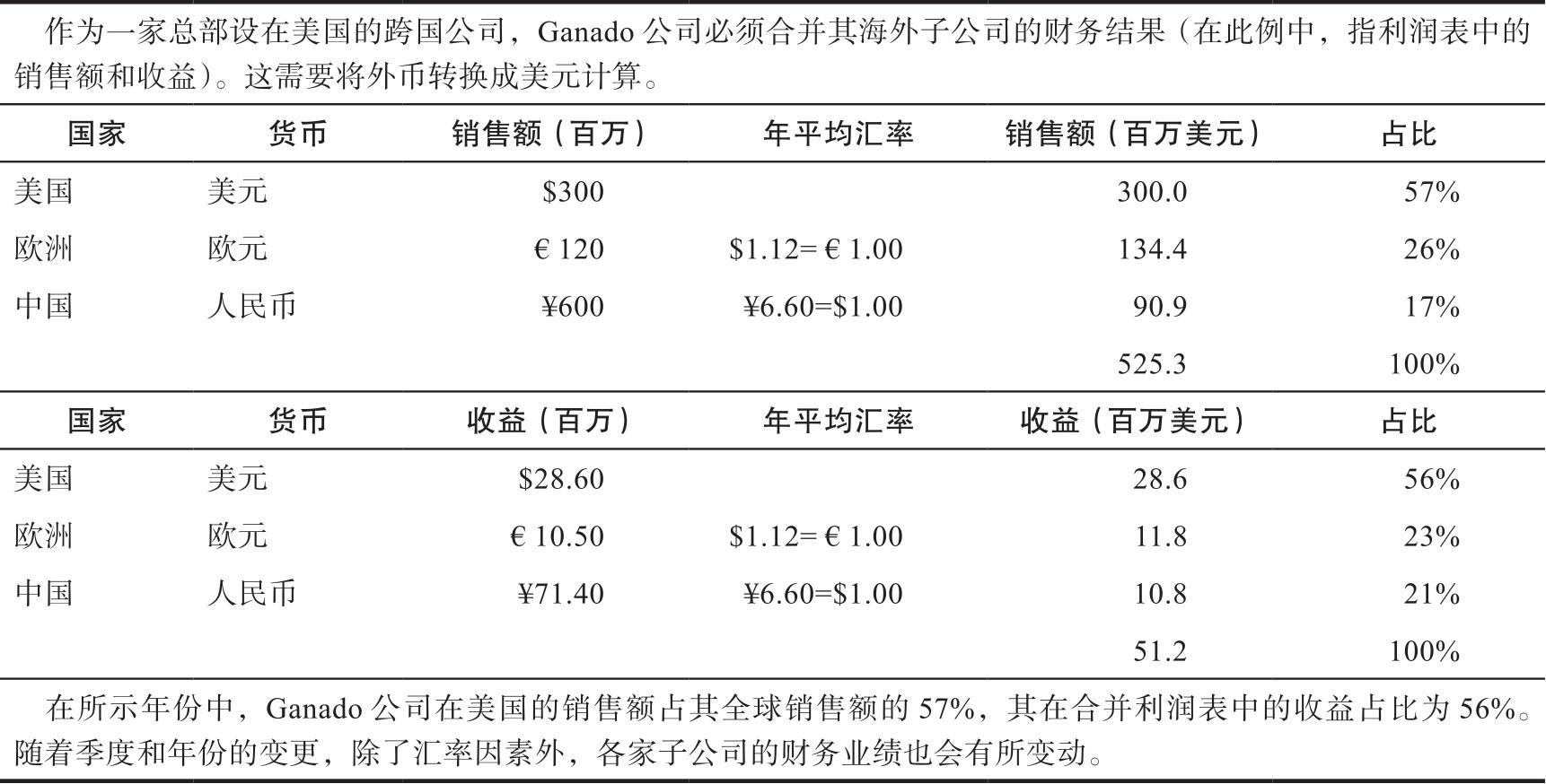 表1.3是Ganado公司简化的合并利润表。假设这家总部在美国的跨国公司,有两家海外分支机构,一家在欧洲,一家在中国。合并财务报表时,该公司必须将各项数据从欧元和人民币折算成美元,使用的是年平均汇率(本例中为一年)。在后面的章节中会看到,由于汇率可能发生非合意的变动,跨国公司将面临许多汇率风险和敞口。