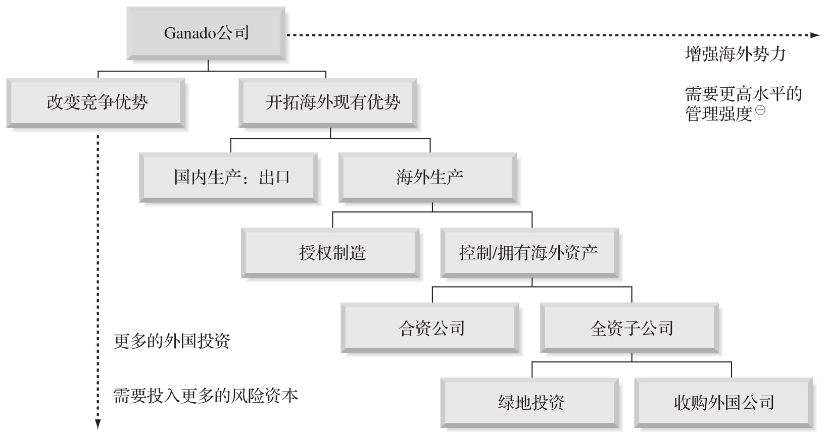 随着Ganado公司沿着图1.3所示的国际化路径不断推进,其海外市场的业务范围相应扩大。公司可能拥有自己的分销机构和生产基地,乃至最终涉足收购其他公司。当Ganado公司在海外拥有众多的资产和子公司后,它就正式步入了全球化的跨国运营阶段。