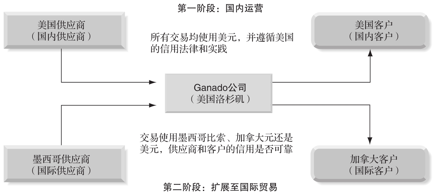 在全球化的推动下,Ganado公司开始从墨西哥供应商那里进口原材料,并向加拿大客户出口产品。我们将这一阶段的全球化进程定义为国际贸易阶段。产品和服务的进出口业务增加了对财务管理的需求,这超出了传统的仅运营国内业务的公司要求。首先,现在公司必须直接承担外汇风险。Ganado公司可能需要以外币报价、接受外币支付或向外国供应商支付外币。由于全球市场上货币价值每时每刻都在变化,Ganado公司将面临越来越多的与外币收支相关的显著风险。