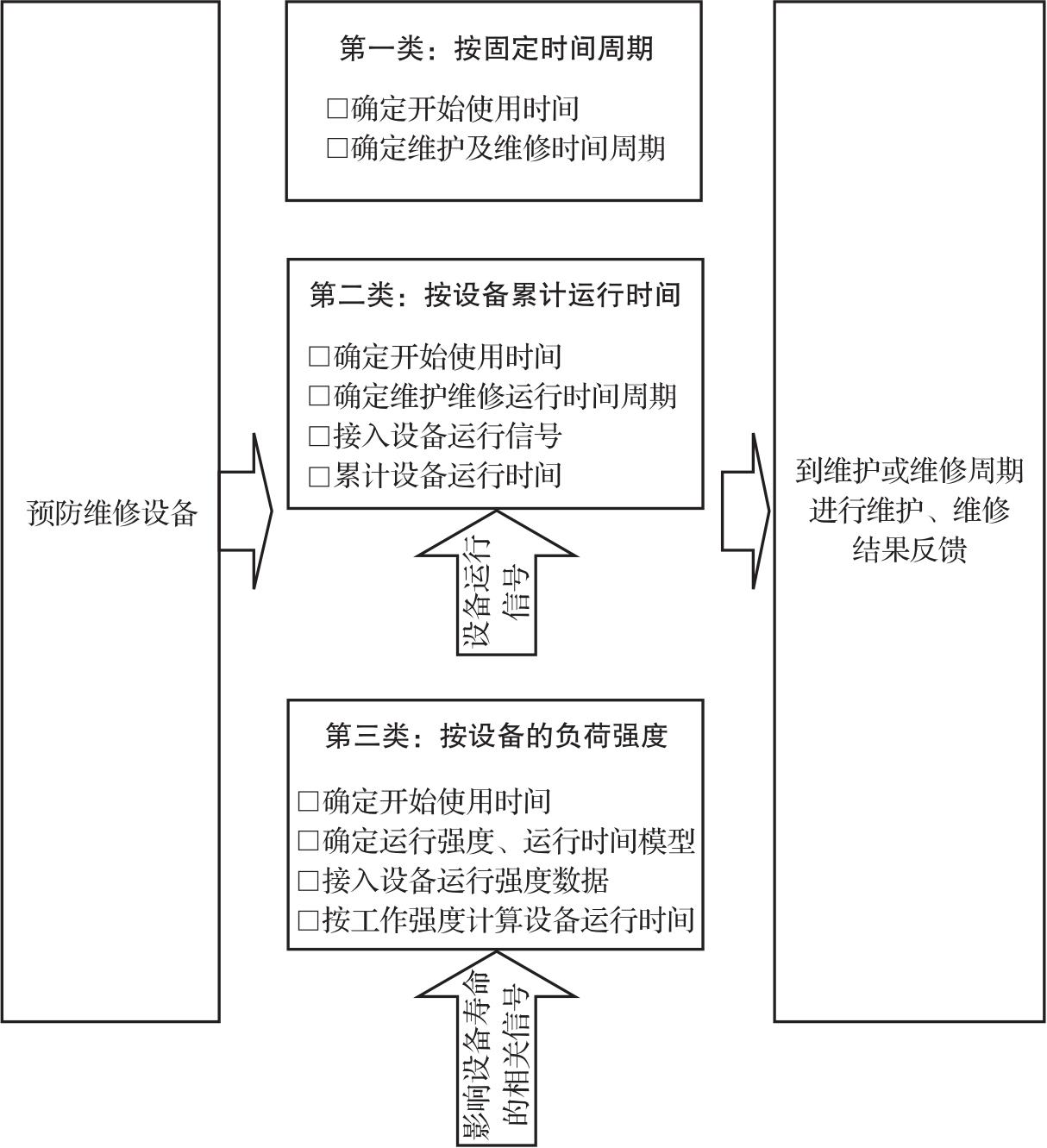 1)对于按照固定时间周期进行维护的设备,无须采集详细的运行数据,条件允许时可采集表明设备是否正在工作的信号(例如电机的转速或电流等),并结合设备的工作指令信号来监控和判断其工作状态。同时,需要明确维修时间周期,以便确定下一次维修的时间。