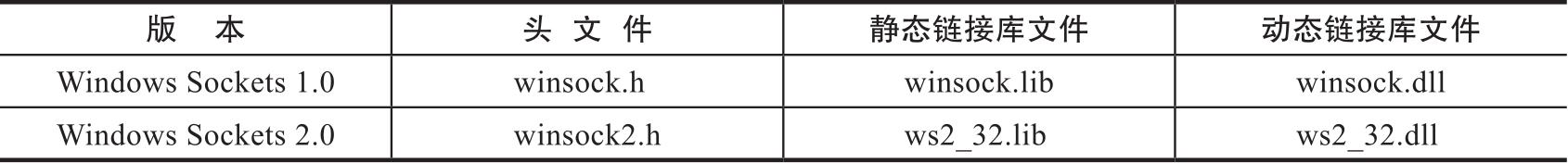 运行组件是Windows Sockets应用程序接口的动态链接库(DLL),应用程序在执行时通过装入它来实现网络通信功能。两个版本的动态链接库如表2-1所示。
