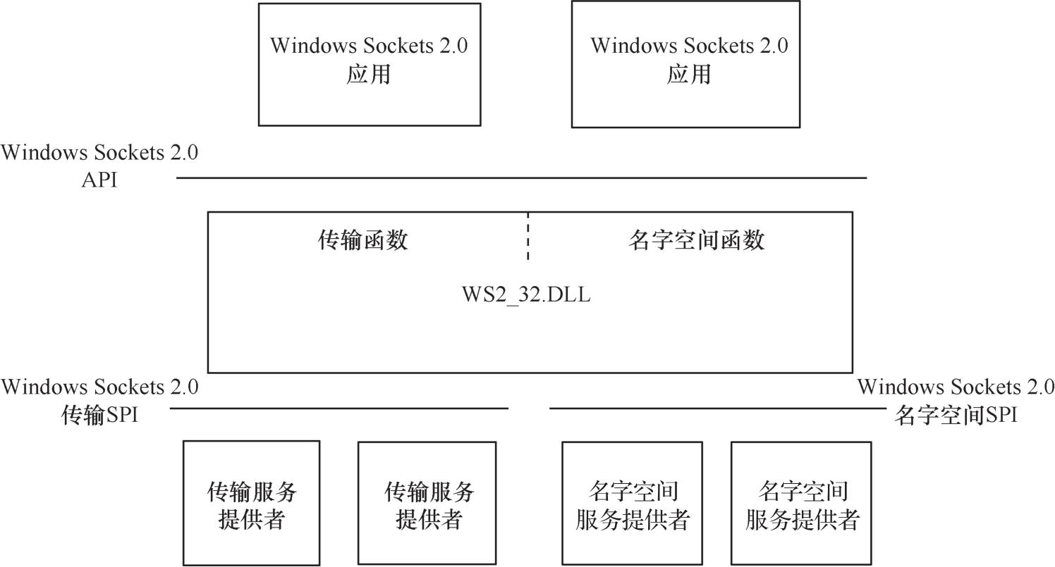 1)体系结构的改变。为了提供同时访问多个传输协议的能力,Windows Sockets的结构在2.0版本下发生了改变。Windows Sockets 2.0通过在Windows Sockets DLL和协议栈之间定义一个标准的服务提供者接口(Service Provider Interface,SPI)改变了原Windows Sockets 1.1和底层协议栈之间的私有接口模式,这使得从单个Windows Sockets DLL中同时访问来自多个厂商的多个协议栈成为可能。Windows Sockets 2.0的体系结构如图2-1所示。