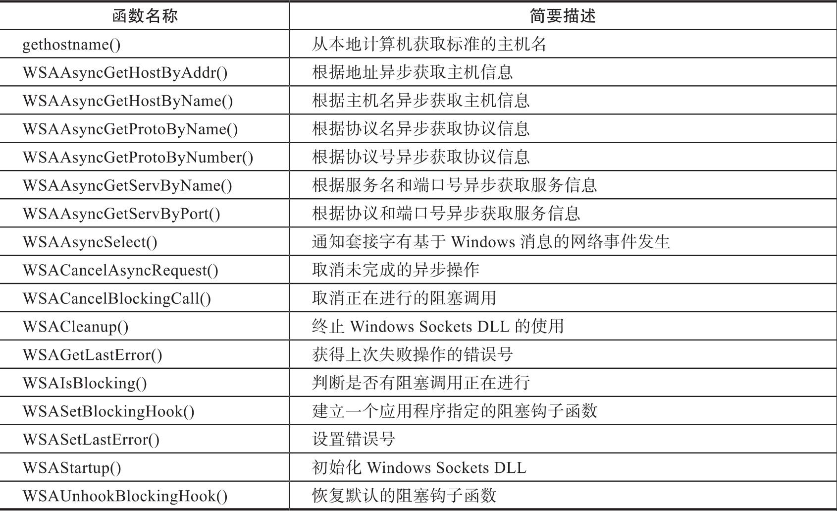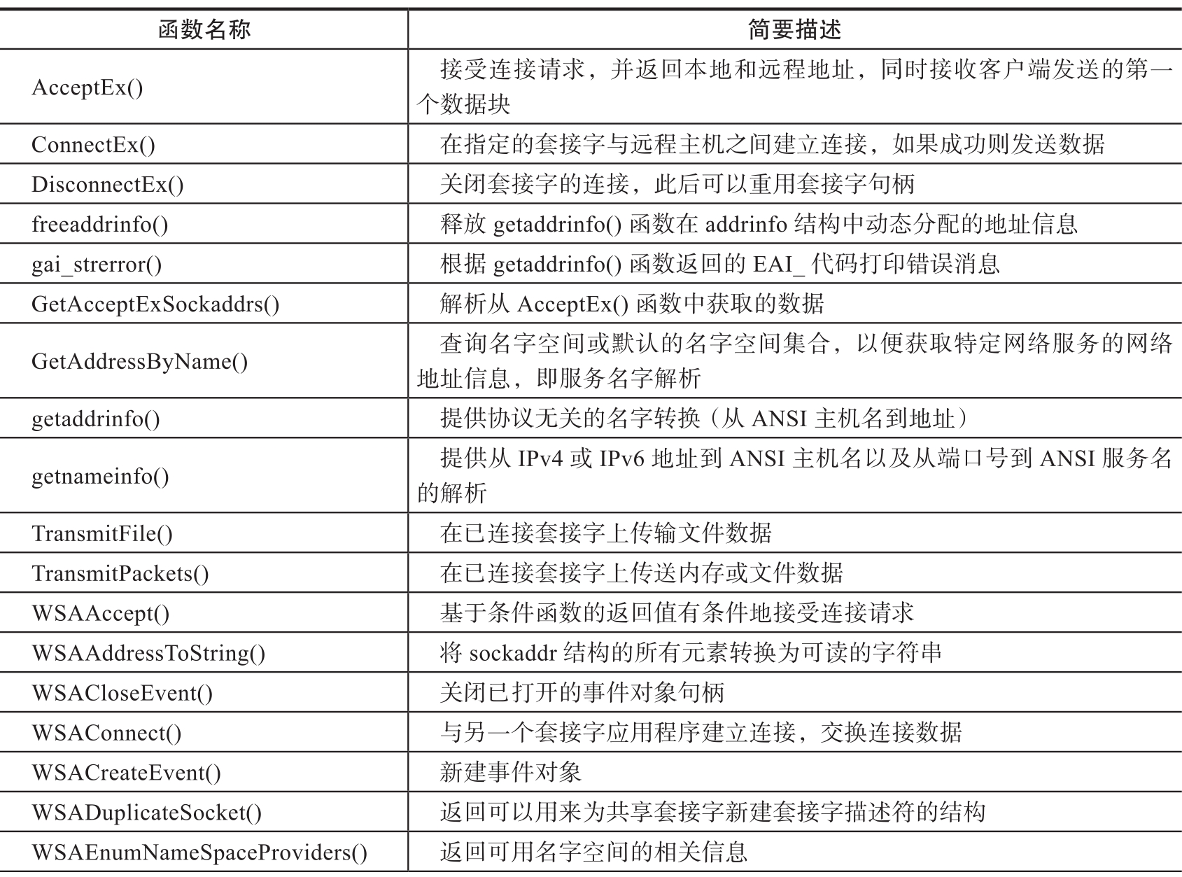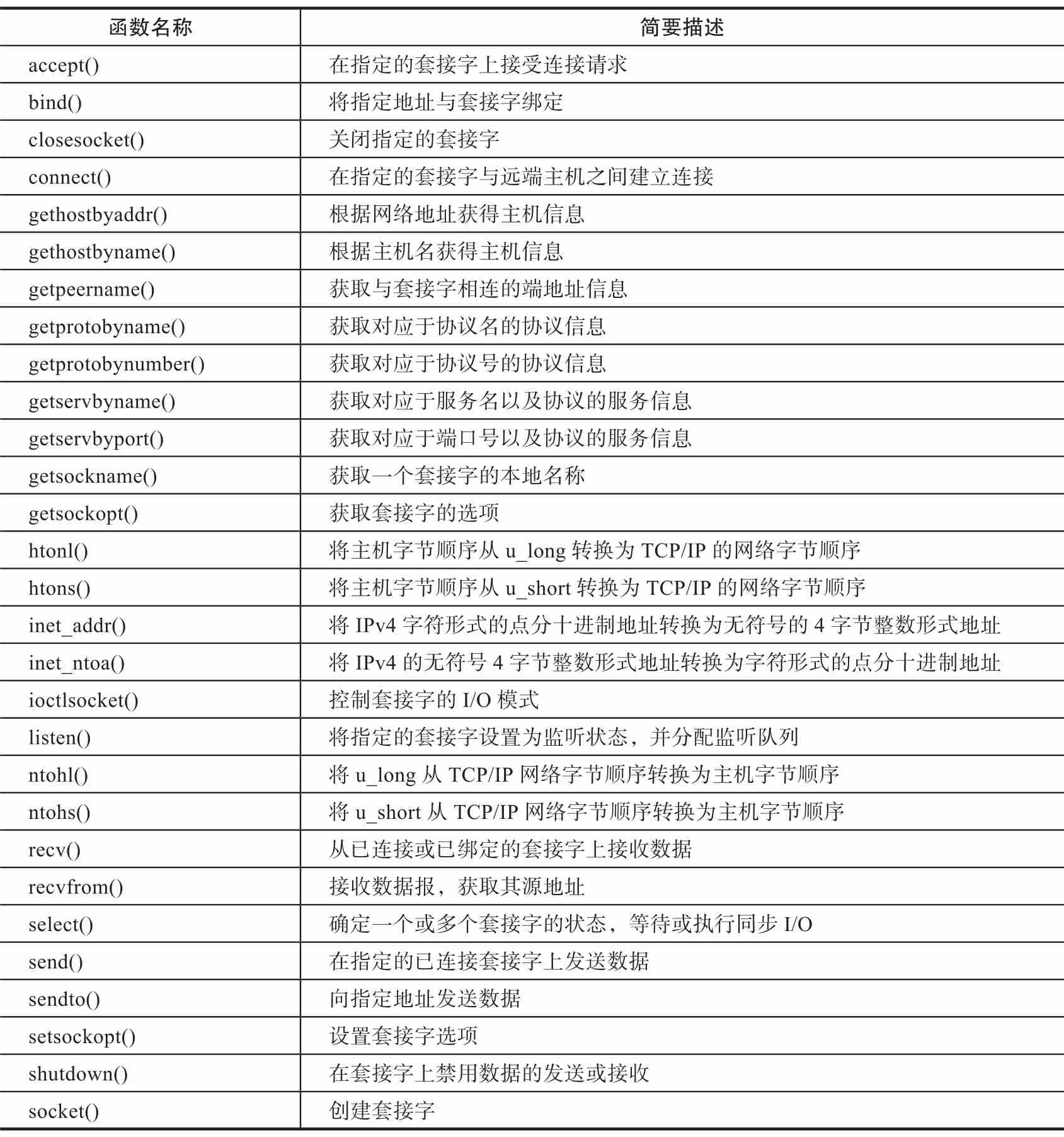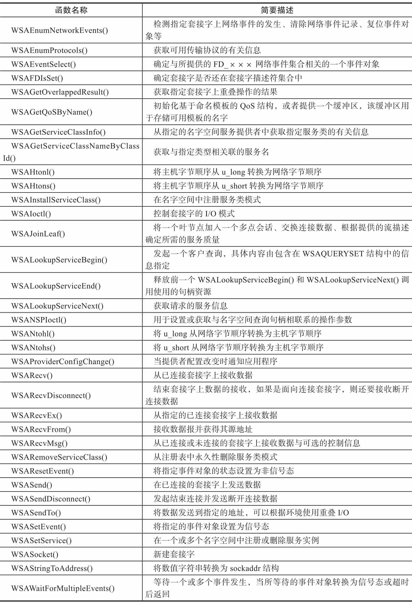 Windows Sockets API是Windows提供的基于套接字的网络应用程序开发的接口。它一方面继承了Berkeley UNIX套接字的基本函数定义,另一方面在Windows Sockets 1.1和Windows Sockets 2.0两个版本上进一步扩展了Windows Sockets特有的功能。表2-2列出了继承Berkeley UNIX套接字的基本函数的命名和功能。表2-3列出了Windows Sockets 1.1扩展的库函数的命名和功能。表2-4列出了Windows Sockets 2.0扩展的库函数的命名和功能。函数的使用细节将在之后的章节中深入介绍。