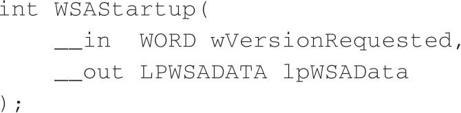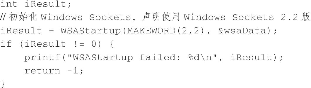 初始化Windows Sockets DLL需要使用函数WSAStartup()。该函数是网络程序中最先使用的套接字函数,其他套接字函数则要在成功调用WSAStartup()后才能正常工作。