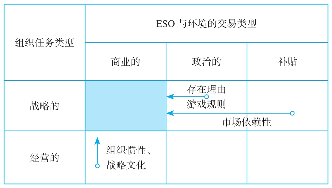 上文的讨论确定了组织活动的两个维度:ESO与环境的交易类型和组织任务类型。这些维度可概括为图2-1,图中阴影部分是本书的研究范围。 我们的研究兴趣仅限于ESO的商业战略行为,包括创业和营销两个方面。