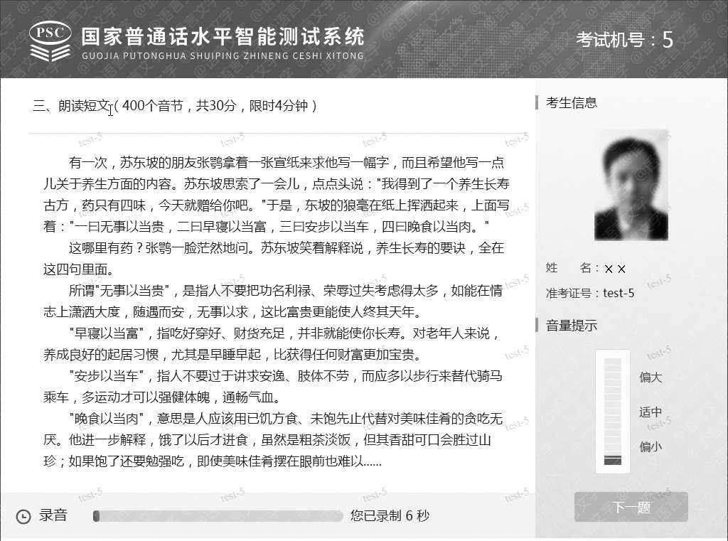 第三题测试时系统界面。请控制好音量和语速,显示的文章读完后点击“
