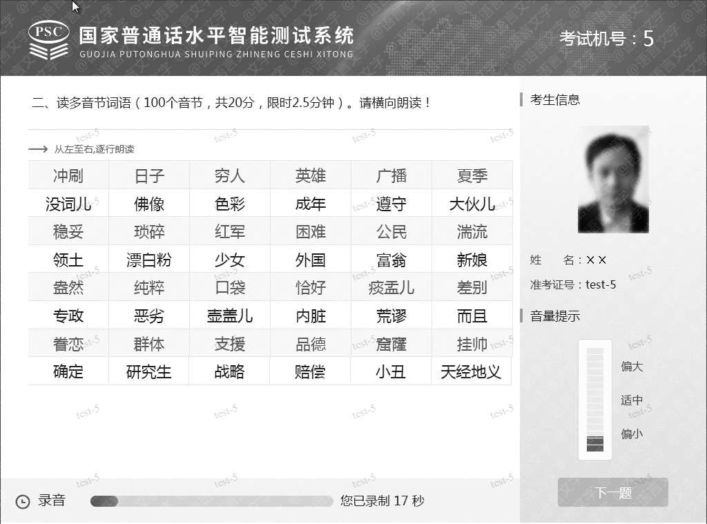 第二题测试时系统界面。请控制好音量和语速,显示的字词读完后点击“