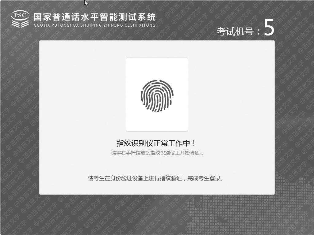 注:如果考生参加测试的站点采用 指纹验证 ,则会在采集信息时采集考生的指纹,那么考生进入测试室时将需要进行指纹验证。如下图所示: