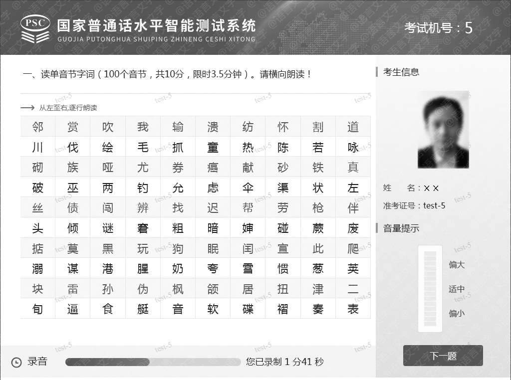 第一题测试时系统界面。请控制好音量和语速,显示的字词读完后点击“