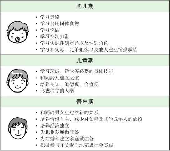 哈维赫斯特的理论有一个特点:从婴儿期到老年期的每个发展阶段,都设定了具体的发展任务,例如“与同龄人建立友谊”或“为职业发展做准备”等,具体如表1–4所示。在人生发展任务的内容方面,这一理论比埃里克森的发展任务理论更具体。