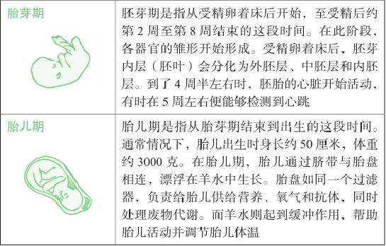 在母体中,从受精到胎儿出生需要260~270天左右(大约40周),这段时间称为胎生期。胎生期可分为三个阶段,如表2–1所示。