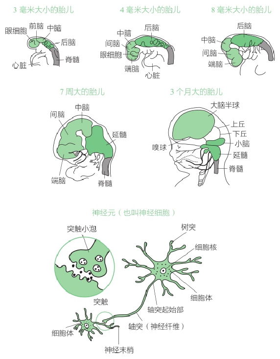 大脑由神经元和胶质细胞构成。神经元由树突、细胞体(包括细胞核及其周边部分)、轴突(即神经纤维)以及神经末梢组成。