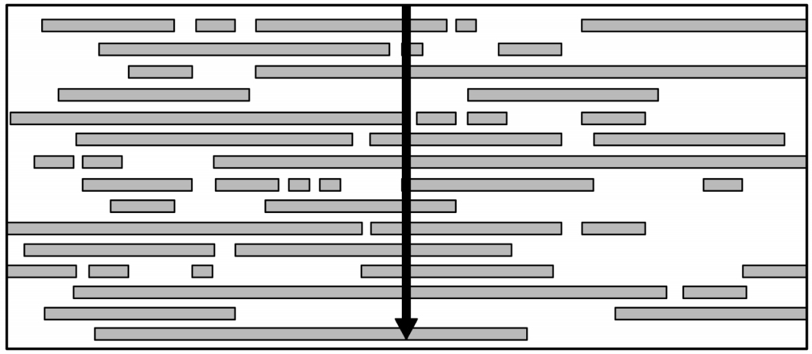 如果你对婚姻感兴趣,希望了解不同的族裔之间通婚或同居的比例。但是,有的浪漫关系可以维系很长时间,有的只维系了很短的时间。在一个人的生命当中,他可能有很多次婚姻,只是有些婚姻不再“存活”了。现在的人口普查数据是每10年收集一次。图2.5是一个示意图:每行表示一个人的生命,每个长条表示一段浪漫伴侣关系,时间从左到右前进。箭头表示我们抽样的时点。在样本中,我们会有过多的维系时间较长的关系,更少抽中维系时间较短的关系。但是,实际的跨族裔婚姻中维系时间较长的关系应该比数据显示的要少,维系时间较短的关系应该比数据显示的要多。