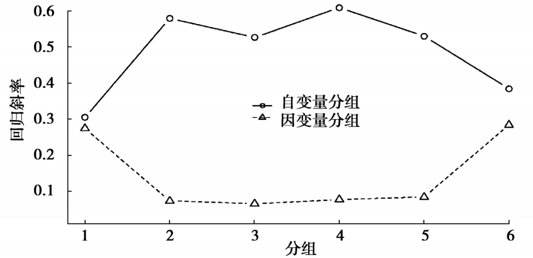 我们可以把数据分成不同子集(subsets),然后对每个子集运行相同的模型,由此得到一系列“局部”参数(local parameters)。我们对数据分组时,是明确地这样做;我们在构建交互项系数时,是含蓄地这样做。上限效应和下限效应,往往会使得这些局部参数呈现出各种各样的U形模式。这里有一个经验法则:如果因变量的取值是有上限和下限的,那么你按 因变量 的取值分组就会使斜率呈现U形模式,按 自变量 的取值分组就会使斜率呈现倒U形模式。