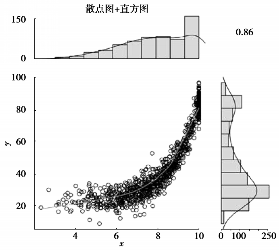 在一定程度上,这支持了我在《领悟方法》中讲过的一个观点: 不要 老想着“检验”自己的理论,至少不要像统计学课上老师教过你的那样。那种做法就好比,因为有人治好了一个病人就给予他医学学位一样。如果你真想检验那个理论,就得真去挑战它,给它找一个相当的对手,然后来场决斗。施奈德是按我们通常的做法来“检验”理论的。他的理论意味着会有U形曲线出现,所以他就去检验U形曲线,但是他没有意识到,U形曲线的出现是由于他理论中最平淡乏味的部分,而不是他以为的理论中最有趣精彩的部分。如何才能避免这种错误?很简单,作图时要同时显示边缘分布(很多情况下被称为“边缘图”[marginal plots])。图2.4就是使用模拟数据做出的边缘图(R2.4)。
