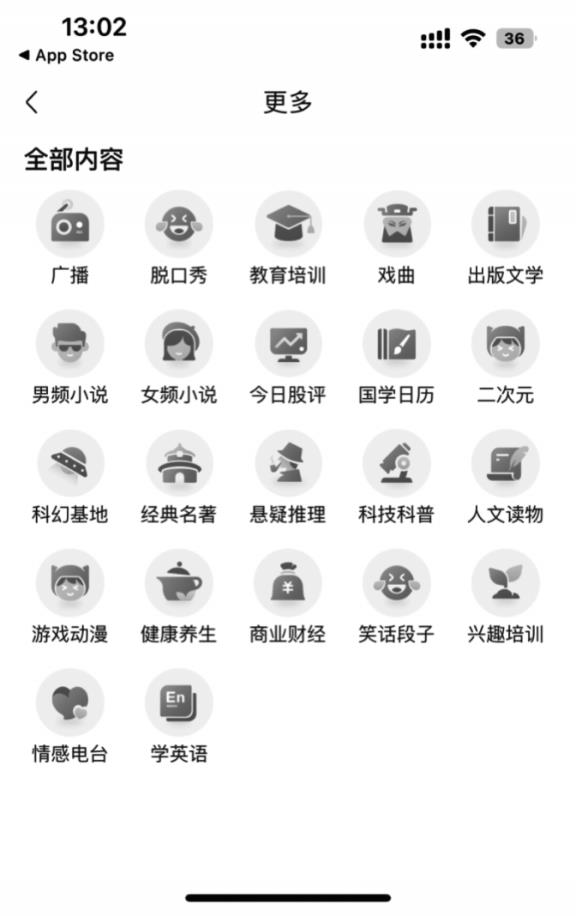 当下,音频产业的盈利模式横向探索已经较为成熟,如广告、内容付费、智能设备盈利等;但在垂直领域,其对市场的探索仍较为欠缺。就内容付费板块而言,大多数音频媒体都聚焦教育、情感、娱乐、文学等领域,如喜马拉雅App的戏曲、科幻基地、人文读物、健康养生等分区;荔枝的情感调频、明星电台、广播剧、催眠、文学等;蜻蜓FM的小说、历史、广播、教育、财经等类别。从音频媒体大致的内容分类来看,其依然停留于内容性质的划分,对垂直内容领域的探索仍显不足(图1-9)。