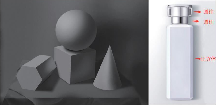 任何物体都是由基本形构成的,生活中许多结构复杂的物体都可以看成是由多个基本形构成的,基本形包含圆柱、圆锥、正方体、长方体、球体等,如图1.2.2 所示,左图为基本形,右图商品结构可以由圆柱体、正方体组成。如果掌握了基本形的光影结构绘制,也就掌握了不同商品的光影结构绘制。