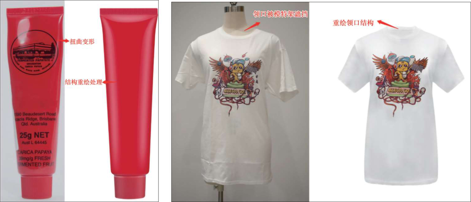 修图时,利用自由变换命令可以处理常见的商品形态歪斜、变形问题,但是商品本身结构的不完整、缺陷、扭曲或拍摄时存在遮挡,导致商品不够规整影响美观,如图1.2.1 所示。如果商品表面比较光滑、没有较多纹理结构,精修师往往会采用重新绘制结构的方法来绘制商品结构。
