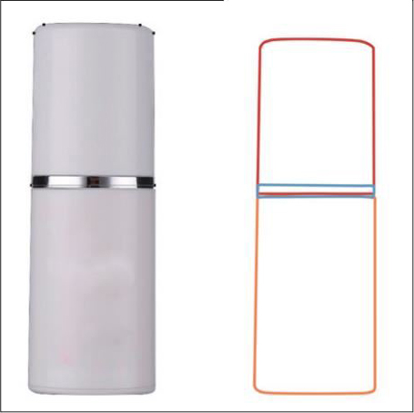 “钢笔工具”可以绘制弯曲的线条,将需要抠出的部分绘制路径,然后通过“将路径作为选区载入”的方式来完成抠图。抠图时注意在结构连接处,处于下层的结构图层绘制路径时可适当延伸抠选范围,确保结构处的无缝对接。如图1.1.16 左图所示,根据视觉结构,瓶体可分为瓶盖、金属圈、瓶身 3 种结构,图层顺序从上到下依次为金属圈、瓶盖、瓶身。图1.1.16 右图所示为抠图路径示意图,蓝色为金属圈路径;红色为瓶盖路径,适当向下延伸;橙色为瓶身路径,适当向上延伸。