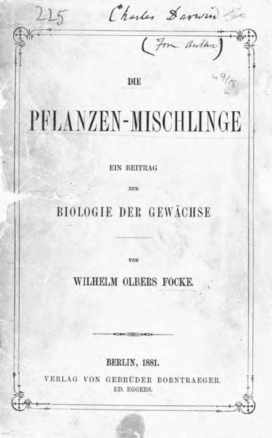 。然而,达尔文从未引用过孟德尔的工作,也没有在霍夫曼的书中做任何关于孟德尔的标注。这同样不令人意外,因为霍夫曼本人并没有理解孟德尔的工作的重要性,他用一句非常简单的话总结了孟德尔的论点:“杂交种后代具有回归亲本的倾向。”达尔文还有另一本藏书提到孟德尔的豌豆实验:威廉·奥尔伯斯·福克(Wilhelm Olbers Focke)的《植物混种》