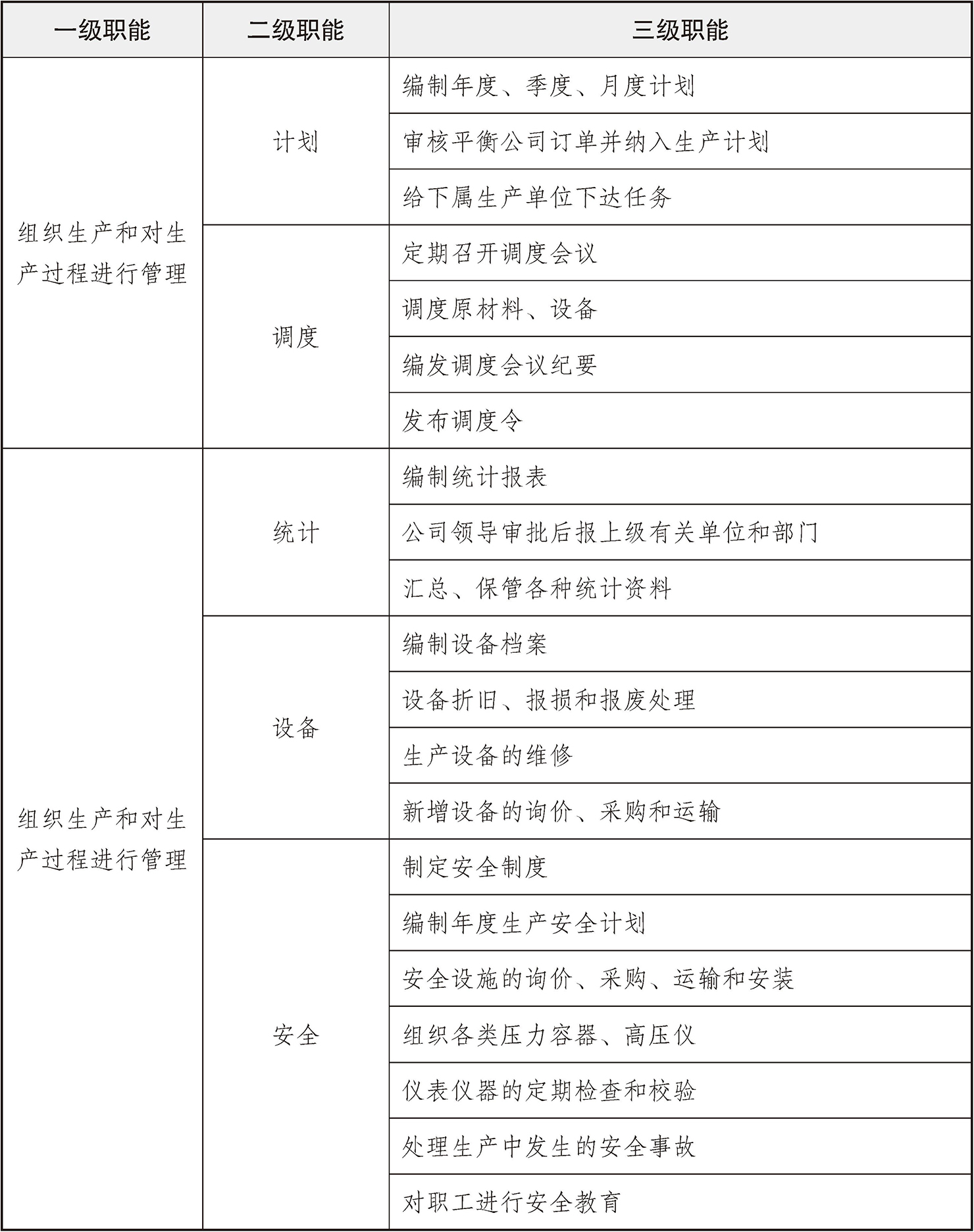 部门职能通常以职能分解表的形成来呈现。职能分解表分成三级:一级职能是部门应该承担的主要职能,通常只用一句话概括;二级职能是完成一级职能所需要做的最重要的几项工作;三级职能是为了完成二级职能要做的一些具体业务工作。表2-3以生产管理部为例进行了部门职能的三级分解。