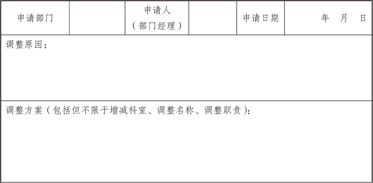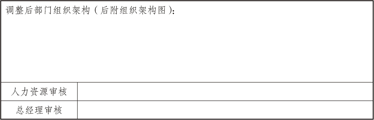 组织架构调整需要撰写调整方案,内容包括部门设立或调整的缘由、调整前后的组织架构图、部门职责、岗位说明书等材料。可以通过制式化的表格来规范组织架构调整工作(如表2-6所示)。